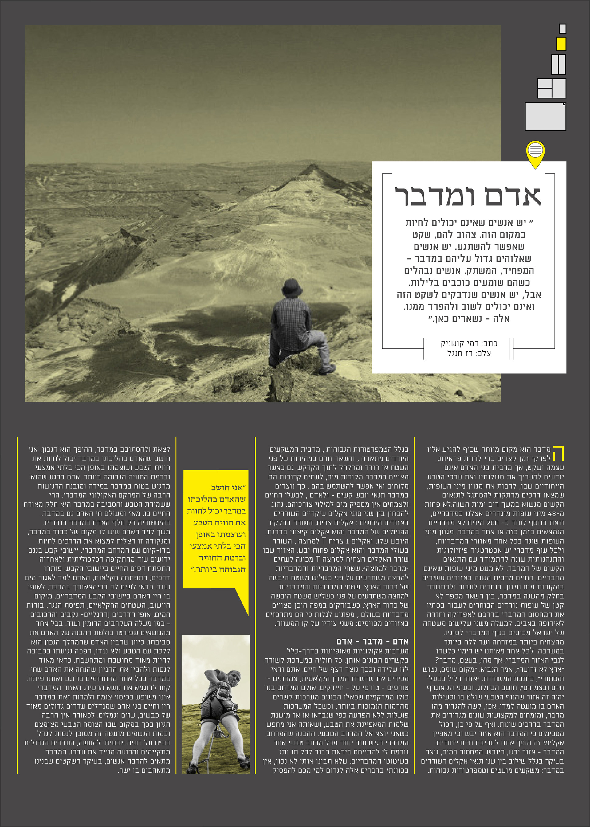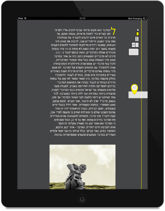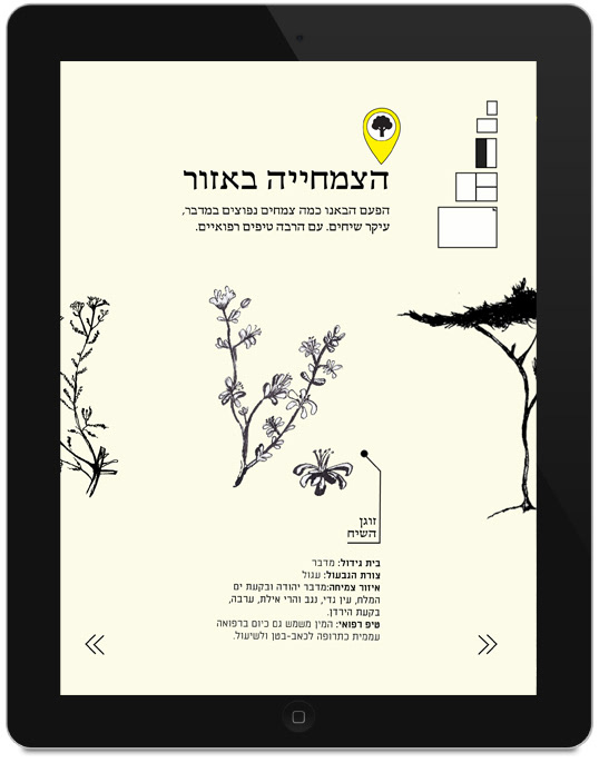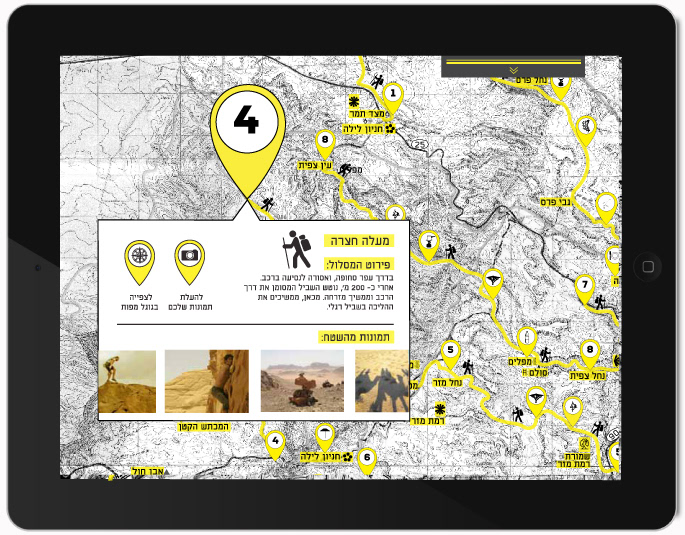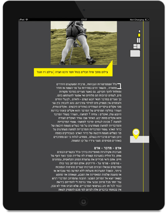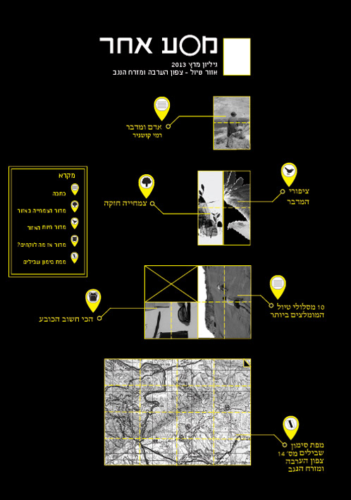 This magazine is an Israeli Masa Aher. Every issue focus on a different area in israel. The magazine is in a map format, one side there is sections and articles, and on the other side there is a map on the area and landmarks.